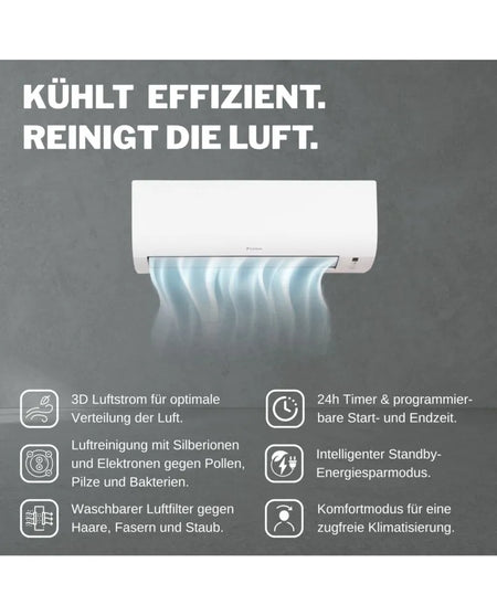Funktionen: Luftstrom 3D-Auto-Swing vertikal und horizontal, Auto-Swing vertikal, Auto-Swing horizontal, Automatische Lüftergeschwindigkeit, 5 Lüfterstufen
